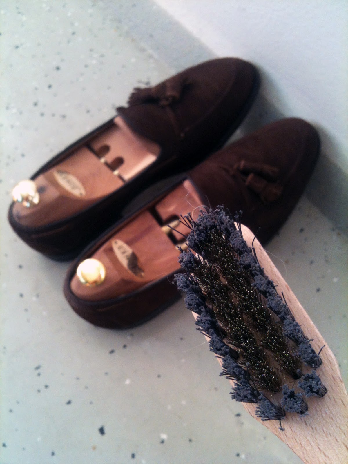 6. Brush them with a suede brush. Mine here is from Saphir, but anything made for this purpose should do. Make sure the suede is properly ’fluffy’ before you move into the next step, as it is important that the suede is not laying flat after the washing and will be equally sprayed.